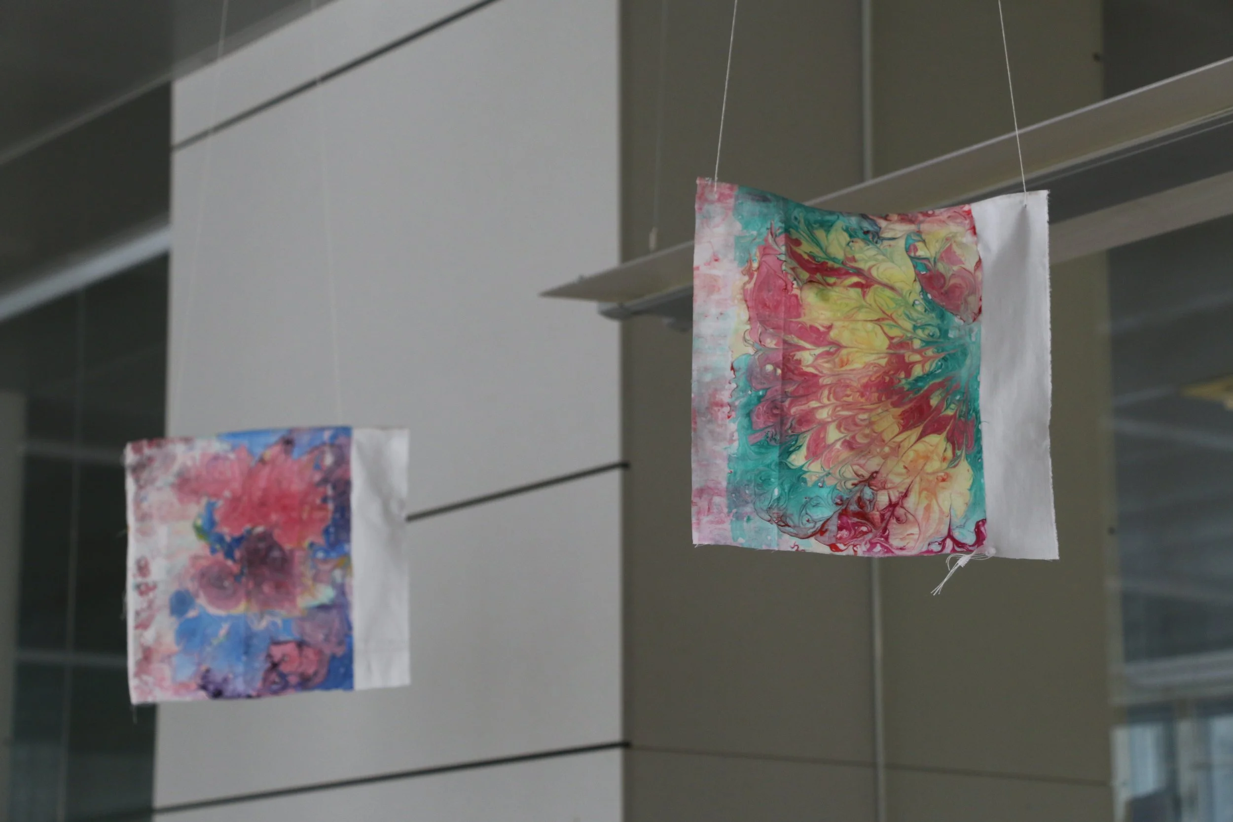 By using the traditional Turkish marbling art Ebru on cotton the art installation consists of 12 hanging pieces following the song ́s path, embedding the diverse substances of the Kâtibim variations. Each of the 12 pieces represent one variation of the song Katibim . Printing on lightweight cotton material - hereby deriving from the traditional head scarf Tülbent - offers the unique pieces to dance and move.
